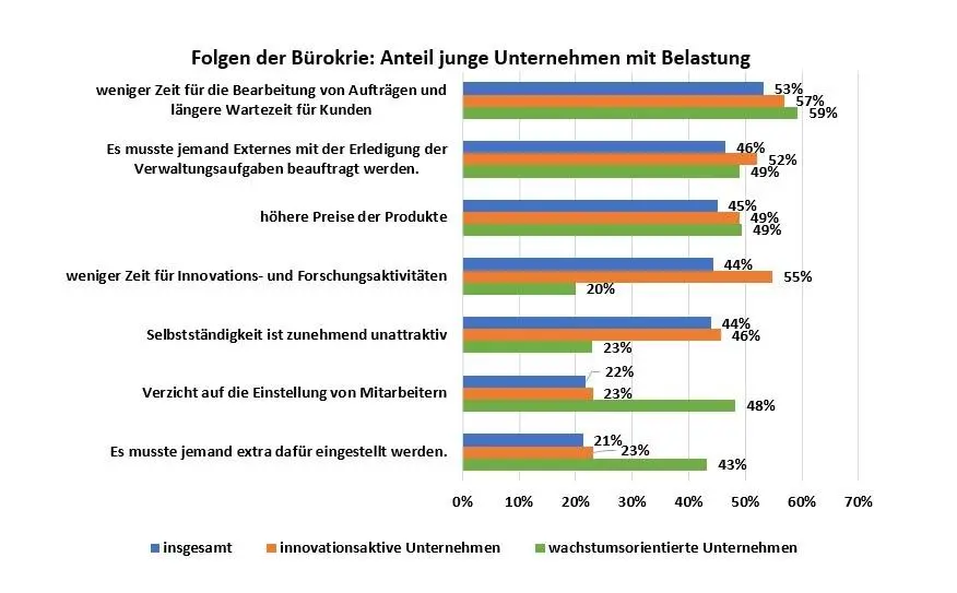 Häufiger als andere berichten vor allem innovationsaktive Unternehmen von negativen Folgen der Bürokratiebelastung. Das gilt besonders stark für ihre Innovationsaktivitäten. Darüber hinaus zeigt sich, dass junge Unternehmen, deren wichtigstes Unternehmensziel Wachstum sei, ausgebremst werden. Die Hälfte dieser wachstumsorientierten Unternehmen verzichtet wegen bürokratischer Hürden auf Mitarbeitereinstellungen.