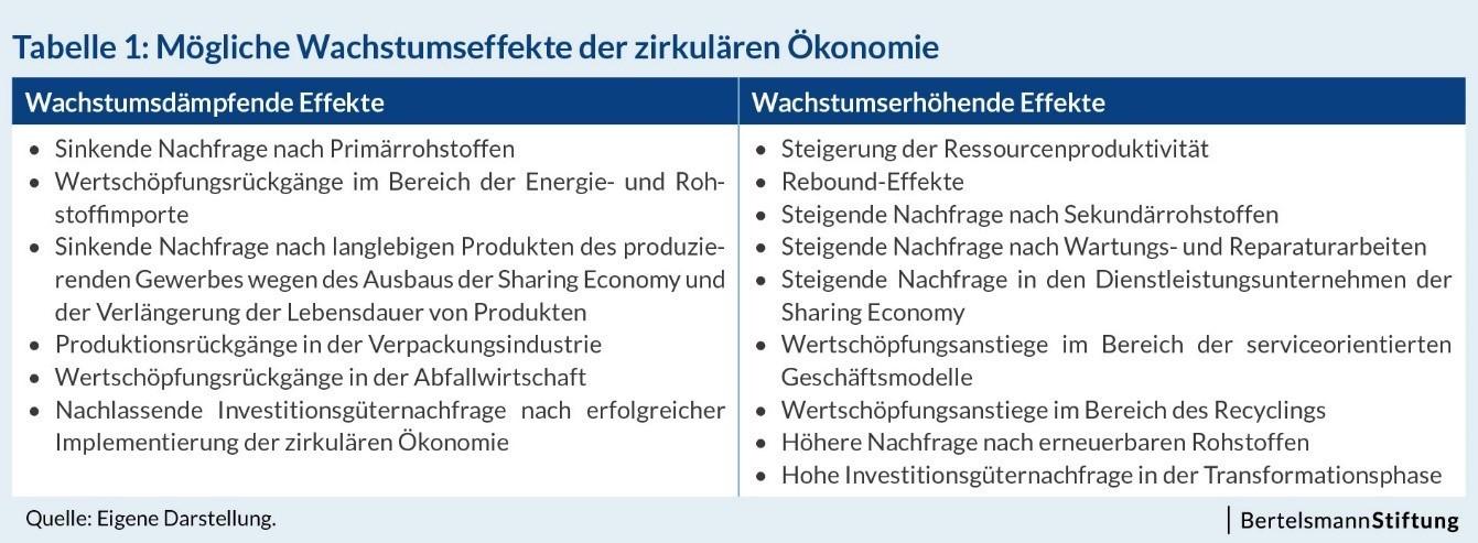 Generell sind im Zuge der Transformation hin zu einer CE sowohl wachstumssteigernde als auch -dämpfende Effekte zu erwarten, von denen einige in der nachfolgenden Tabelle exemplarisch dargestellt sind: