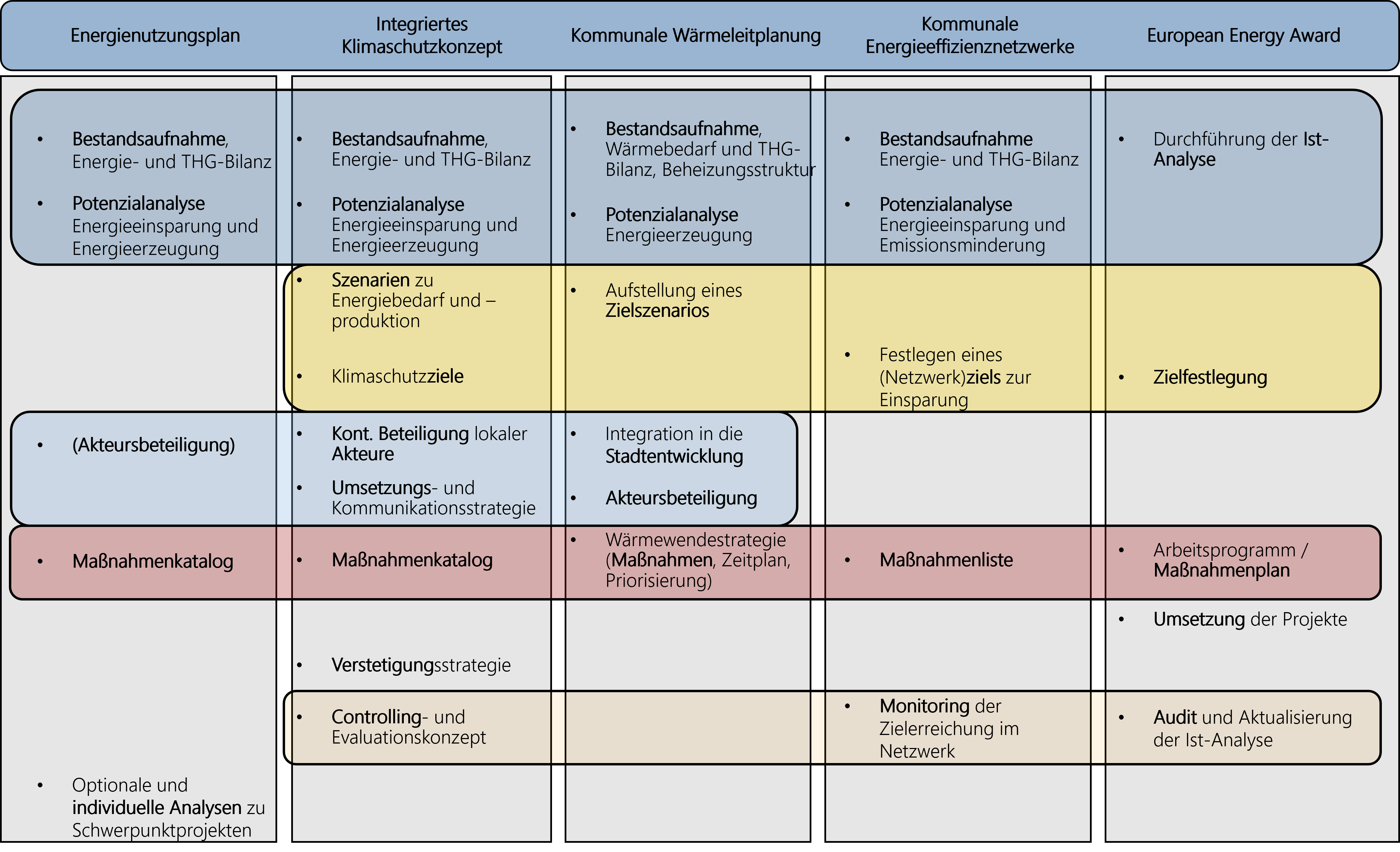 Die Zusammenfassung zeigt, dass sich alle beschriebenen Hilfsmittel in ihrer grundlegenden Struktur ähneln, aber unterschiedliche Schwerpunkte aufweisen. So erfolgt in jedem Fall eine Analyse des Ist-Zustandes auf die in der Regel eine Potenzialanalyse folgt. Anschließend erfolgt grundsätzlich die Entwicklung von Maßnahmen zur Erreichung der Klimaschutzziele, die entweder im Rahmen eines vorgelagerten Schrittes festgelegt oder durch die Kommune bereits vorangehend beschlossen wurden.