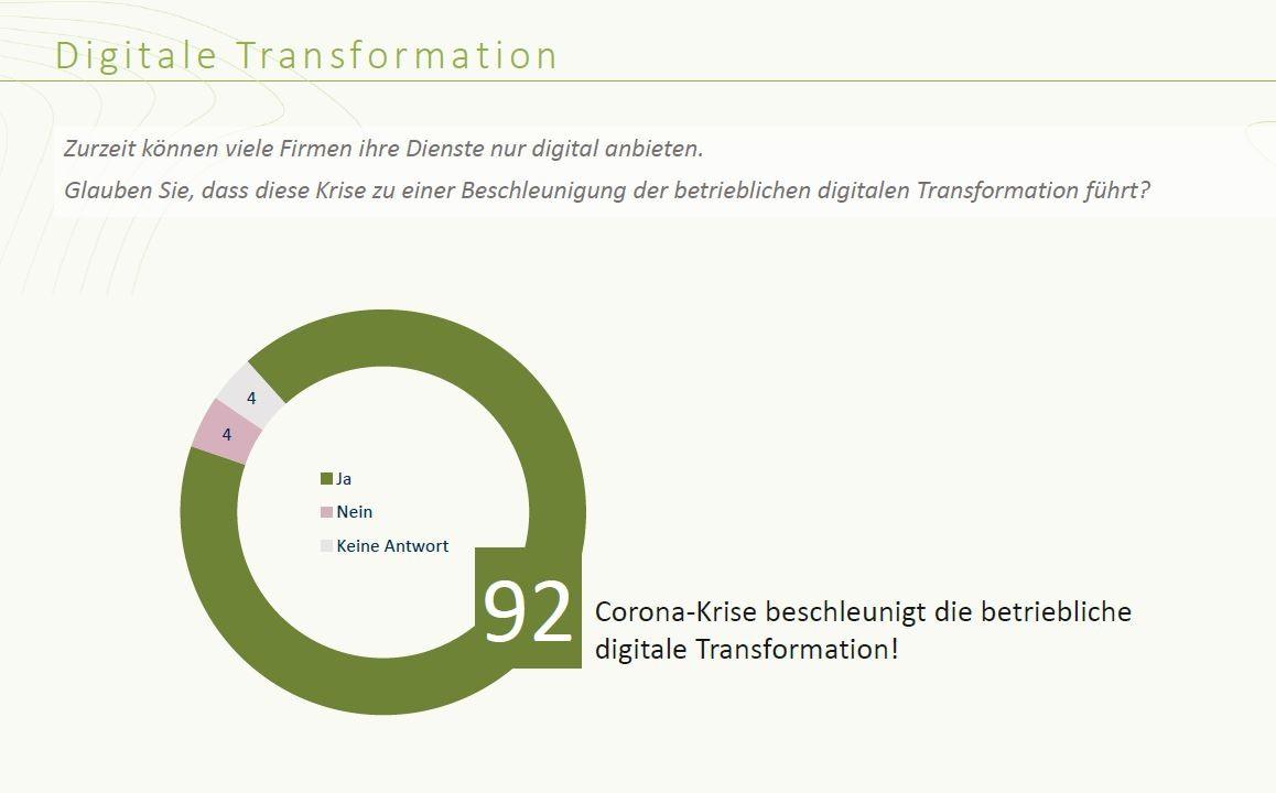 92 Prozent der ExpertInnen gehen davon aus, dass die Krise die digitale Transformation in Unternehmen beschleunigen wird.