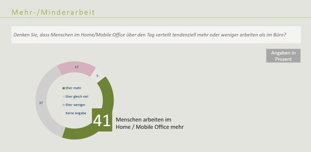 Sowohl die räumliche wie auch die zeitliche Verteilung der Arbeit wird sich langfristig an den in der Krise neu etablierten Standards orientieren. Dem Vorurteil, dass die weitgehend isolierte Art des Arbeitens zu verminderter Arbeitsleistung führe, begegnen 87 Prozent der Befragten, indem Sie sagen, dass im Home/Mobile Office mindestens gleich viel, wenn nicht sogar mehr gearbeitet würde.