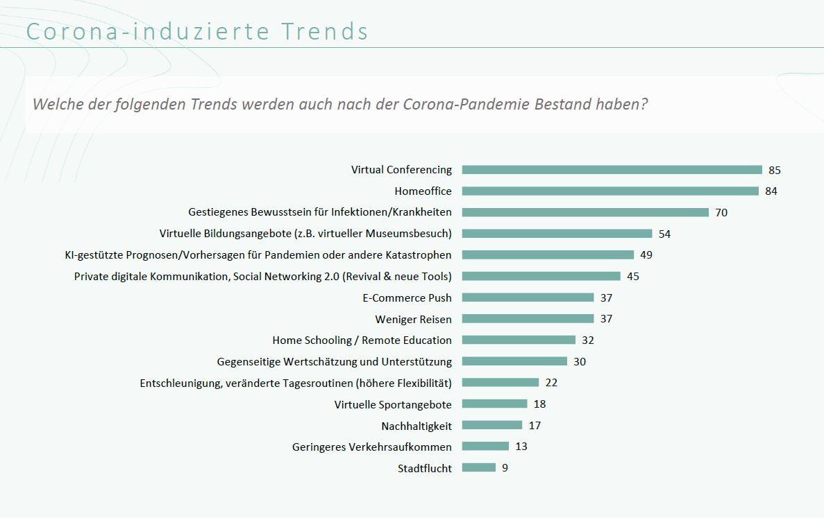 Die zweite deutlich erkennbare Tendenz aus den Antworten der ExpertInnen ist weniger erfreulich: die durch die Pandemie hervorgerufenen positiven Effekte für die Nachhaltigkeit einer digitalen Arbeitskultur wie z.B. weniger Dienstreisen, weniger Flüge, ein geringeres Verkehrs- bzw. Pendleraufkommen, das Andauern der Stadtflucht, die allgemeine Entschleunigung und die verstärkte Wahrnehmung der Bedürfnisse anderer werden voraussichtlich keine langfristige – also nachhaltige Wirkung haben. Nur 17 Prozent der Befragten erwarten, dass die Menschen auch nach der Überwindung der Krise einem nachhaltigeren Lebens- und Arbeitsstil folgen werden.