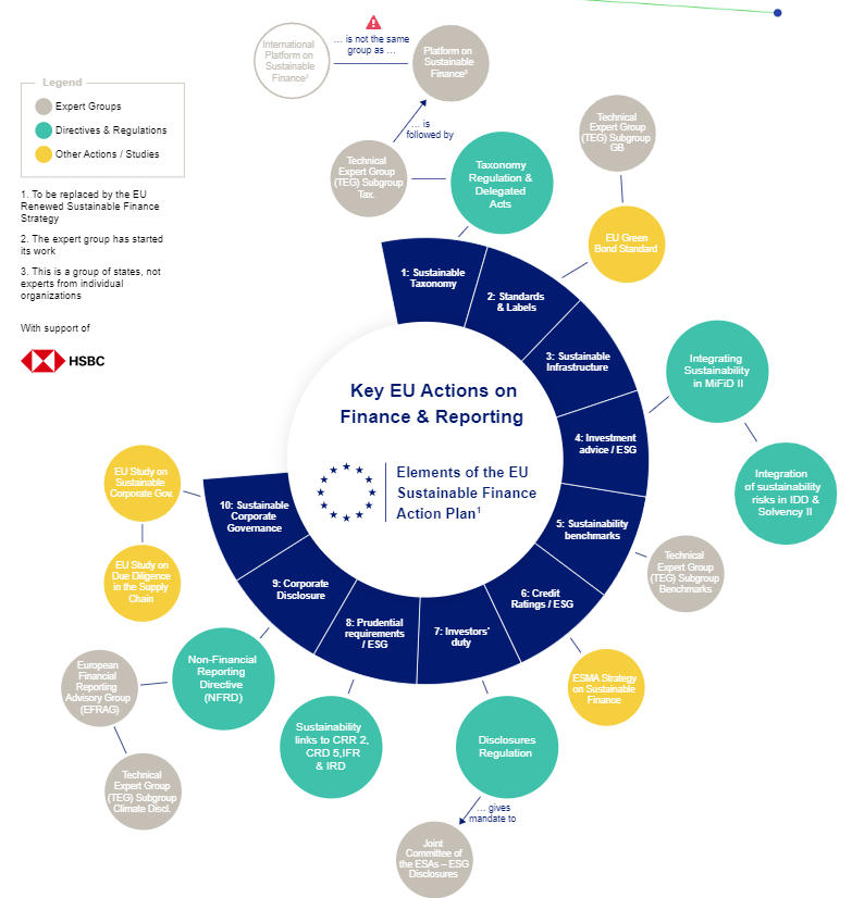 Ein Überblick, zu dem was derzeit insgesamt in der regulativen Pipeline ist: Infografik Sustainable Finance | econsense.