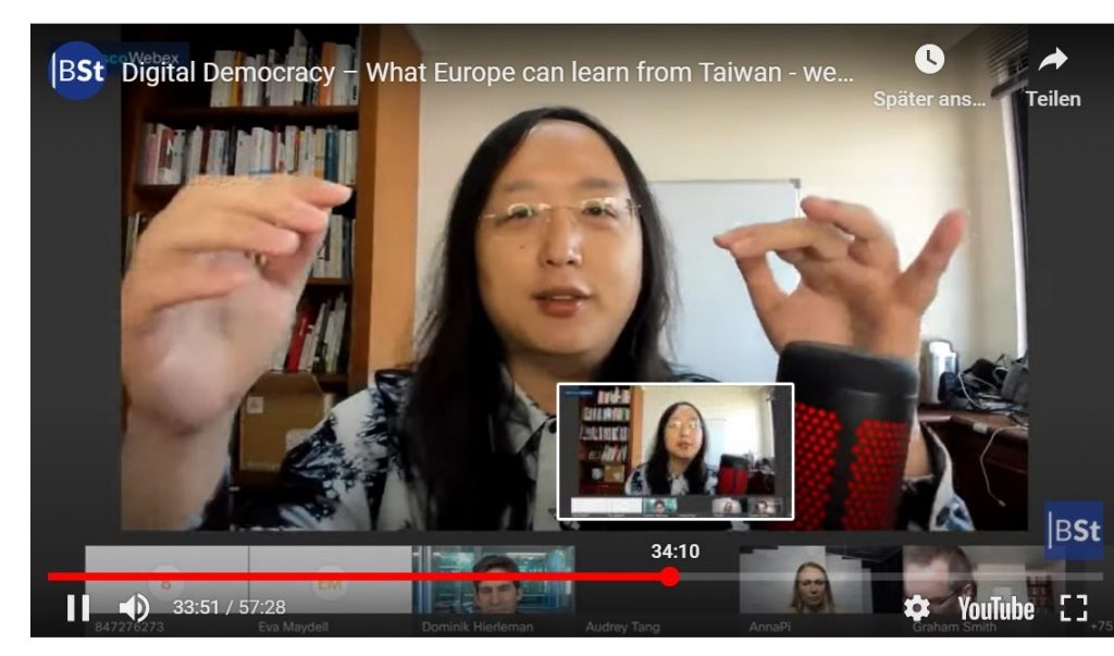Eine Video-Diskussion mit Audrey Tang (s.o.) und Taiwan’s Strategie zu Digitaler Demokratie finden Sie hier: https://www.bertelsmann-stiftung.de/de/unsere-projekte/demokratie-und-partizipation-in-europa/projektnachrichten/digitale-demokratie-was-europa-von-taiwan-lernen-kann-1