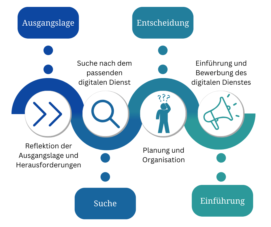 Die Einführung eines Dienstes muss also auf die vor Ort existierenden Rahmenbedingungen angepasst werden. Dies muss in jeder Phase bedacht werden. Nur dann kann aus einem digitalen Dienst eine digitale Lösung werden, die in der eigenen Region akzeptiert wird und ihre Wirkung entfalten kann. Wie sieht also ein passendes Vorgehen aus?