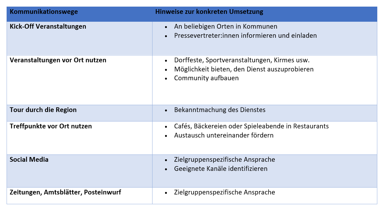 Hier eine Übersicht an beispielhaften Kommunikationswegen für die Bekanntmachung von Diensten vor Ort: