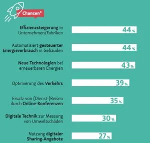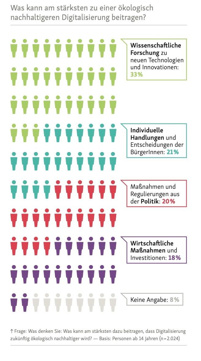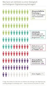 - Bei der Frage, wer am ehesten für eine nachhaltige Transformation „verantwortlich“ ist, ergibt sich erneut ein diffuses Bild, das eber eben mit mangelnder historischer Erfahrung mit einer solchen Transformation verbunden sein könnte. Wissenschaftler Forschung wird zu 33%, individuellen Handlungen zu 21%, Politik zu 20% und der Wirtschaft zu 18% Verantwortung für eine Nutzung der Digitalisierung zur Erreichung einer nachhaltigen Lebens- und Produktionsweise zugewiesen. Vielleicht spiegelt aber diese relativ gleiche Zuschreibung von Verantwortlichkeiten auch einfach die Tatsache wider, dass es sich hierbei um eine gesamtgesellschaftliche Aufgabe handelt. Etwas skeptisch stimmen muss eventuell der relativ höchste Anteil, der hier von Seiten der Befragten der Wissenschaft zugeordnet wird. Skeptisch natürlich nicht mit Blick auf die Rolle der Wissenschaft, wohl aber mit Blick auf die „Retterrolle“, die hiermit verbunden ist. Andere Studien haben dies auch die „Fortschrittsillusion“ bezeichnet, die die Hoffnung transportiert, dass das eigene Verhalten nicht verändert werden muss, sondern eine Art „Wundertechnik“ die Umweltprobleme einfach von allein lösen wird.