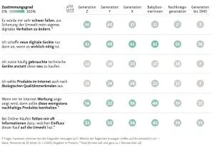 - Das abschließende Unterkapitel, dass sich mit dem Stand des konkreten Wissens über Nachhaltigkeitsaspekte der Digitalisierung befasste, offenbart nochmals, wie ausbaufähig dieses Wissen insgesamt ist (auch die Mitglieder unserer Arbeitsgruppe konnten nicht alle Fragen korrekt beantworten). Dieses Wissen ist aber elementar wichtig, wenn es darum geht, eigenverantwortlich nachhaltige Konsumentscheidungen zu treffen. Hier wird von den Befragten erwartet, dass Unternehmen sich auch in ihrer Werbung und in der Produktwerbung mehr um die Darstellung der Nachhaltigkeit ihrer Produkte kümmern. Jeder zweite Befragte bemängelt, dass diese Informationen beim Einkauf im Internet nicht dargestellt werden (Es wäre spannend abzufragen, ob dies im stationären Einzelhandel besser dargestellt wird. Zweifel sind angebracht.)