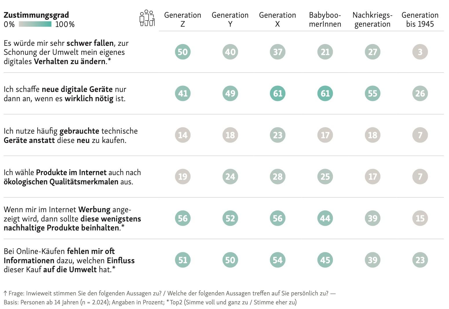 - Der Verweis auf die Verantwortung der Wissenschaft und die geringere eigene Verantwortung verstärkt sich ausgerechnet mit steigendem Einkommen und steigender Bildung. Umso höher das Haushaltseinkommen und die eigene Bildung, desto weniger sind die Befragten bereit, den Nachhaltigkeitsaspekt in ihrem digitalen Nutzungsverhalten zu berücksichtigen.