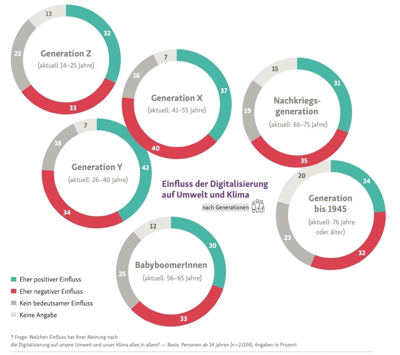 - Die Chancen der Digitalisierung werden von der sogenannten Generation Y (26-40 Jahre) als einzige von allen Generationen höher gewichtet als die Risiken. Dies ist nicht ohne Relevanz, da sich gerade diese Generation beruflich aufmacht, in der Arbeits- und Geschäftswelt die nächste Entscheidergeneration zu stellen. Diese Perspektive gibt also Anlass zur Hoffnung, dass wir in den anstehenden schwierigen Jahren der Bewältigung des Klimawandels eine Aufbruchsstimmung erreichen können.