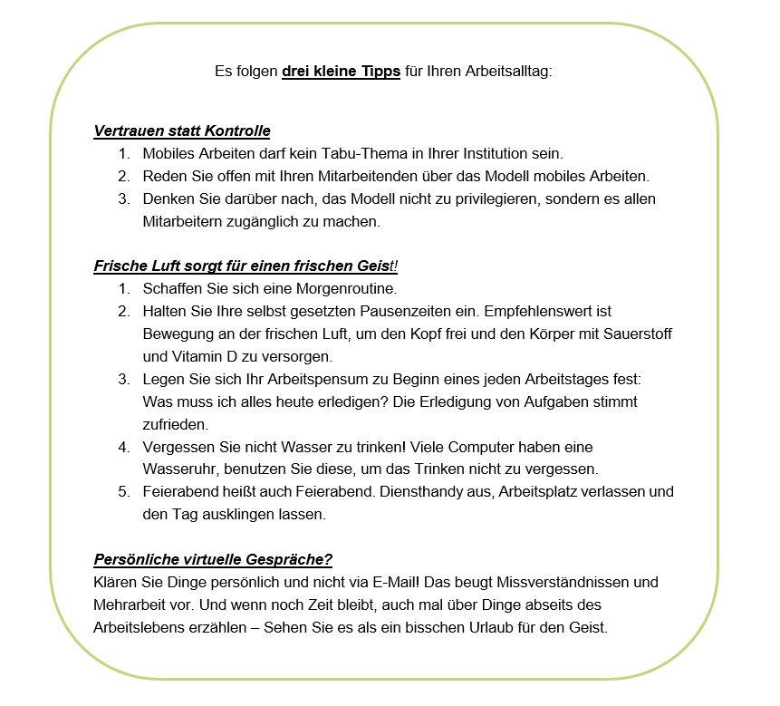Die bekannten Vorteile des flexiblen Arbeitszeitmodells werden durch unsere Ergebnisse bestätigt. Nur die fehlende soziale Interaktion, die ständige Erreichbarkeit und das Ausbleiben von Erholungsphasen sind wahrzunehmende Belastungsfaktoren.