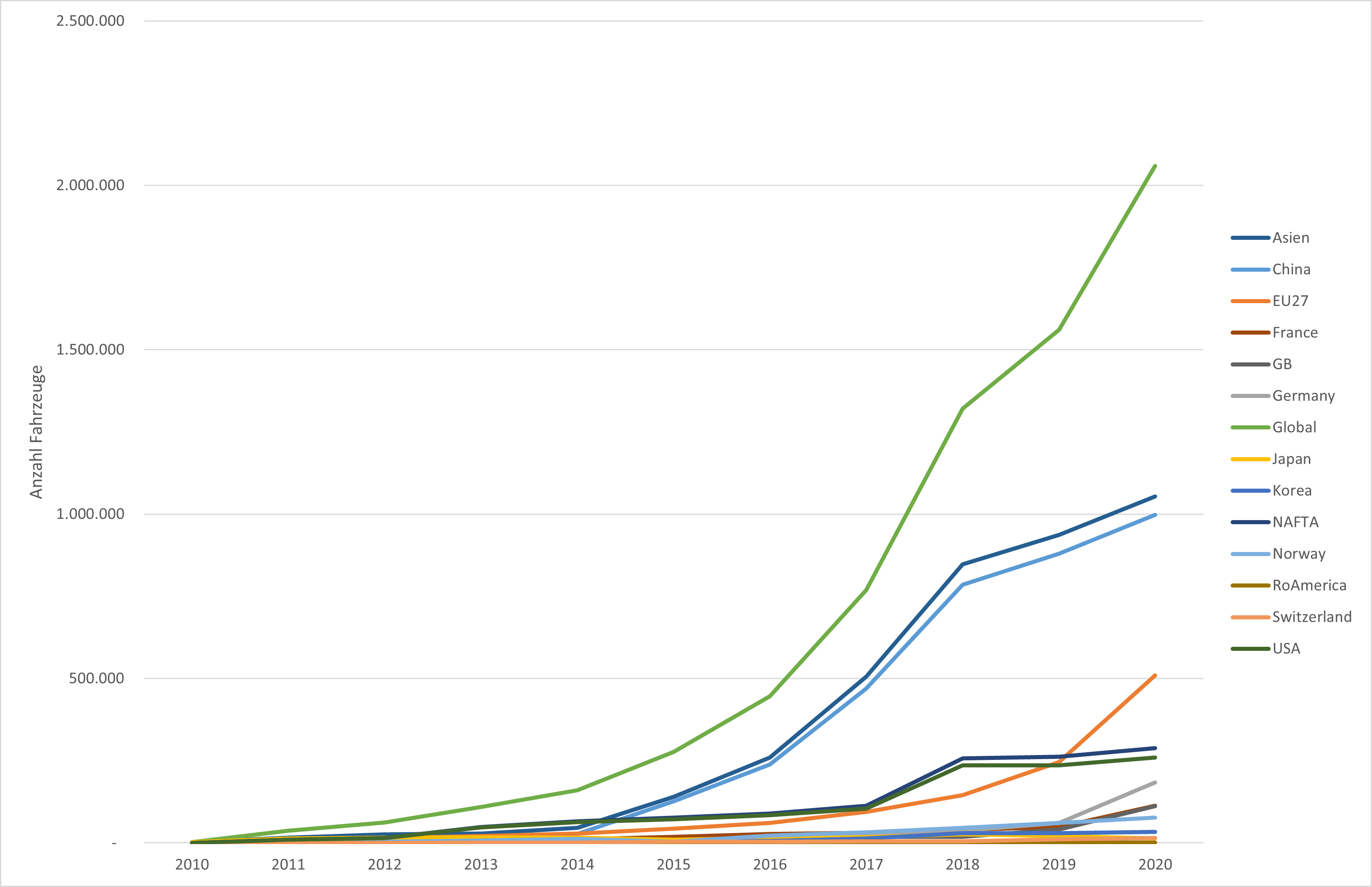 Insbesondere Asien und Norwegen wiesen frühzeitig hohe absolute Absatzzahlen von BEV auf. In Deutschland scheint sich die Technologie etwas verzögert durchzusetzen, verzeichnete aber insbesondere in den vergangenen beiden Jahren enorm hohe Wachstumsraten.