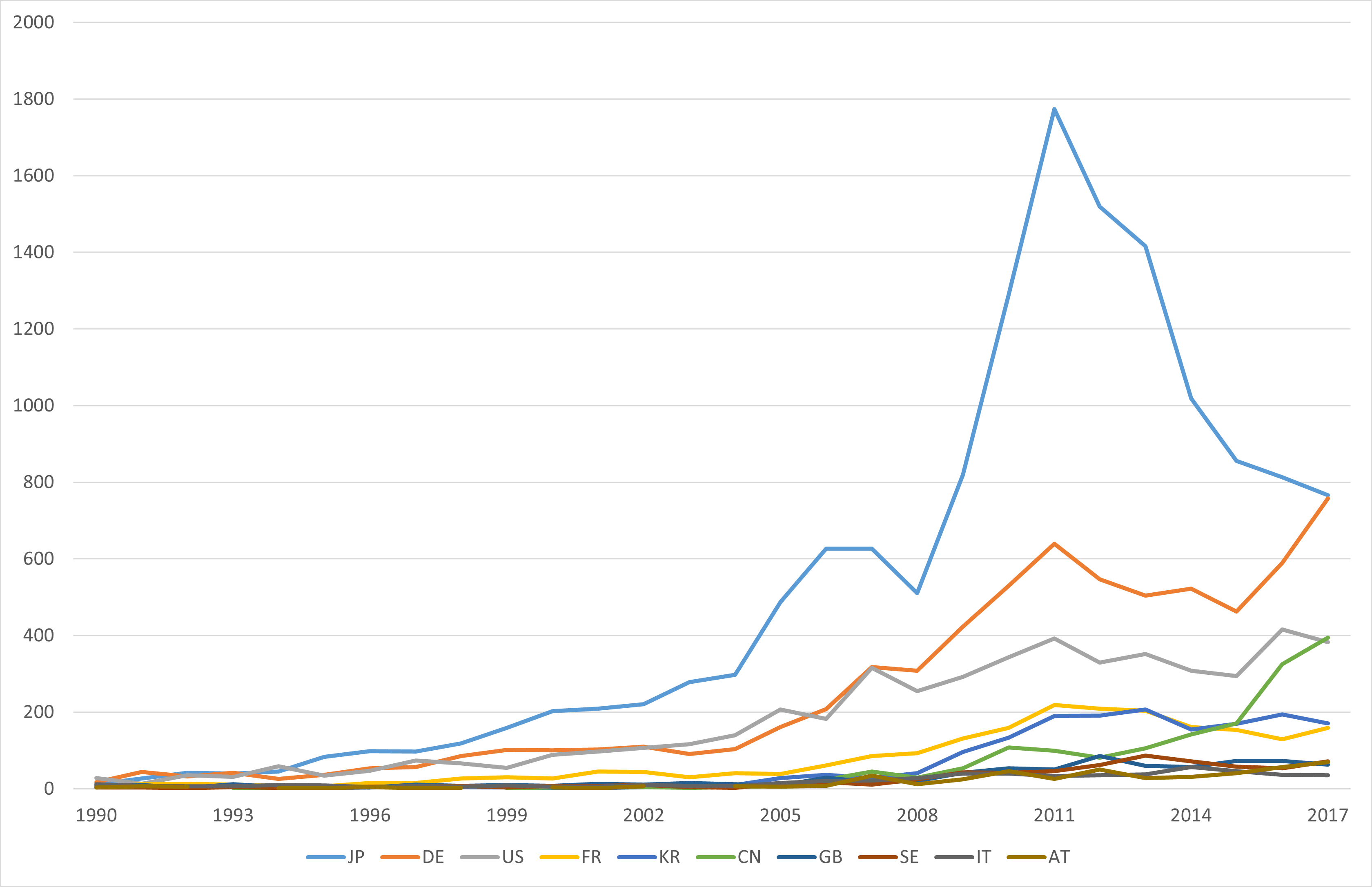 Abbildung 2: Alternativer Antriebe – Patentanmeldungen nach Ländern, Quelle: [4], Abbildung 5, S. 15