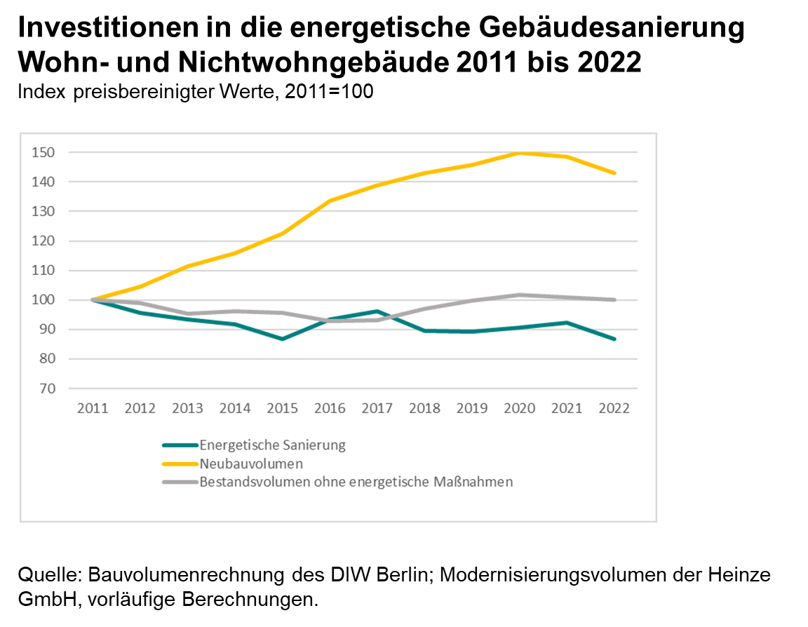 Der erste Tiefpunkt der realen Investitionen in die energetische Gebäudesanierung war 2015. Es folgte eine zwischenzeitlich deutliche Erholung der Investitionstätigkeit. Seit 2018 verharren die jährlichen realen Investitionssummen aber weit unter dem Niveau des Ausgangsjahres. Mit den zuletzt starken Preissteigerungen wurde 2022 ein neuer Tiefpunkt erreicht. Das reale Investitionsvolumen liegt nun gut 13 Prozent niedriger als 2011.