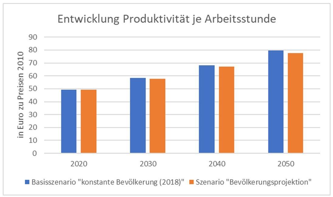 • In einem Basisszenario wird unterstellt, dass die Bevölkerung Deutschlands (Größe und Struktur) bis 2050 auf dem Stand des Jahres 2018 „eingefroren“ wird. Demografiebedingte Änderungen der Arbeitsproduktivität werden damit ausgeblendet.