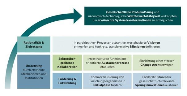 Hiermit geht auch ein neues Verständnis von Innovationspolitik einher: Waren technologischer Fortschritt und wirtschaftliche Wettbewerbsfähigkeit über lange Zeit die allem übergeordneten Ziele, so soll und muss Innovation heute auch und besonders zur wirksamen Lösung gesellschaftlicher Probleme, etwa mittels sogenannter Missionen, beitragen.