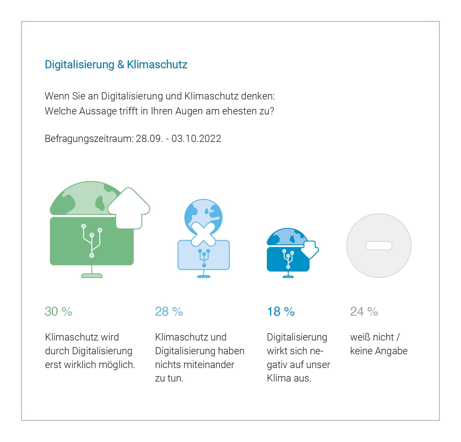Digitalisierung und Klimaschutz haben nichts miteinander zu tun, so die Aussage von 28 Prozent der Arbeitnehmenden in Deutschland. Und sogar 18 Prozent sind der Auffassung, dass sich die Digitalisierung negativ auf unser Klima auswirkt. Lediglich ein Drittel ist überzeugt davon, dass Klimaschutz durch Digitalisierung erst wirklich möglich wird.