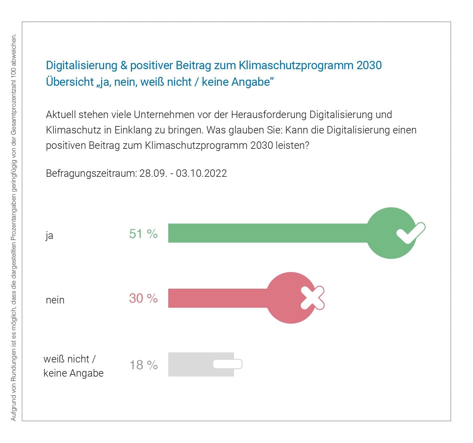 Geht man jetzt noch einen Schritt weiter, glaubt zwar immerhin über die Hälfte (51 Prozent) der Berufstätigen, dass die Digitalisierung generell einen positiven Beitrag zum Klimaschutzprogramm 2030 leisten kann. Jedoch sind auch ganze 30 Prozent nicht davon überzeugt.