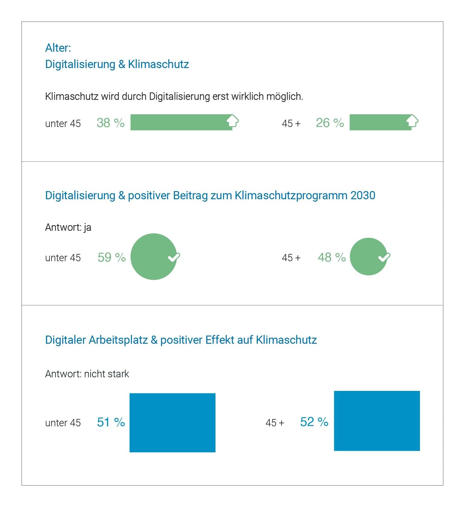 Bei den unter 45-jährigen glauben dies schon 38 Prozent. Zudem sind 59 Prozent der jüngeren Berufstätigen von einem positiven Beitrag der Digitalisierung zum Klimaschutzprogramm 2030 überzeugt. Bei den älteren Berufstätigen sind es nur 48 Prozent. Doch bei einem sind sich beide Altersgruppen einig: Jeweils über die Hälfte (52 Prozent der älteren und 51 Prozent der jüngeren Beschäftigten) ist der Überzeugung, dass der Einsatz des digitalen Arbeitsplatzes in ihrem Unternehmen keine starke Wirkung auf den Klimaschutz hat.