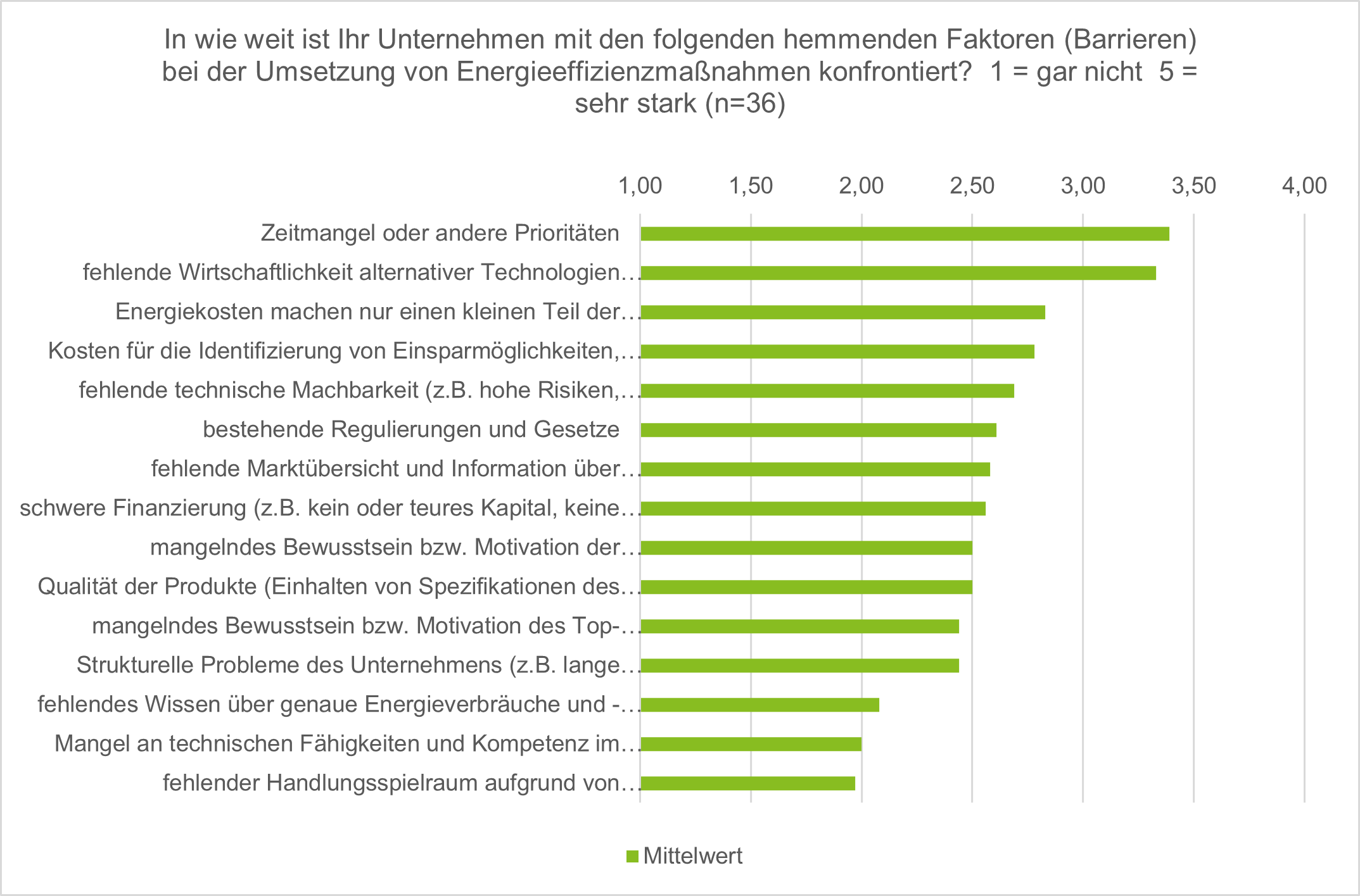 In einer eigens durchgeführten Umfrage im Auftrag der Sächsischen Energieagentur SAENA GmbH hinsichtlich der Barrieren bei der Umsetzung von Energieeffizienzmaßnahmen bei sächsischen Unternehmen (KMU-Anteil 53 %) zeigte sich, dass es den Unternehmen vor allem an Zeit mangelt, konkrete Maßnahmen umzusetzen, da anderen Tätigkeiten eine höhere Priorität haben. Dies deckt sich mit den Erfahrungen von Ressourcenengpässen, aber auch fehlendem Bewusstsein/Weitblick bei KMUs.
