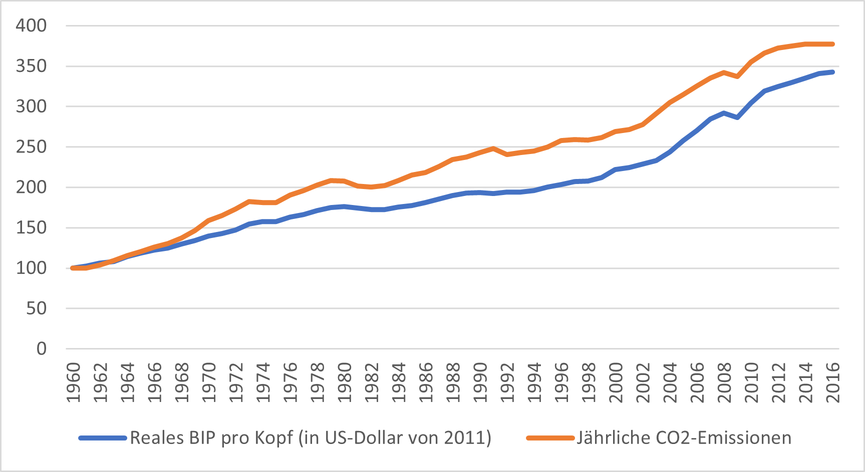 Abbildung 1: Weltweites BIP pro Kopf und CO2-Emissionen (1960=100)