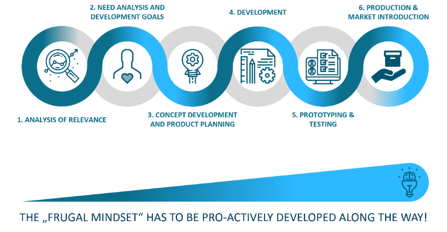 Zwar gibt es vereinzelt Versuche, einen standardisierten frugalen Innovationsprozess zu entwickeln. Aber eine Kernschwäche der bekannten frugalen Innovationsprozesse liegt darin, dass diese oftmals zu kurz greifen. Sie stellen die Entwicklung der Innovation in den Vordergrund, vernachlässigen aber den ganzheitlichen Blick auf das Geschäftsmodell bzw. auf das notwendige Ökosystem, das für den Erfolg von frugalen Produkten vonnöten ist. Zudem wird die Thematik des frugalen Mindsets in diesen Prozessen oft wenig bis gar nicht berücksichtigt. Neuere Erkenntnisse im Rahmen unserer Forschung sowie unserer Beratungstätigkeit zeigen jedoch, dass es essentiell ist, das frugale Mindset pro-aktiv entlang des Innovationsprozesses zu entwickeln (siehe Abbildung 1).
