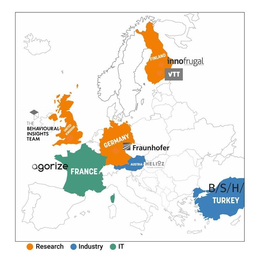 Dieser Aufgabe stellen sich sieben Partner aus sechs Ländern: Fraunhofer IAO und IRB (Deutschland), VTT und InnoFrugal (Finnland), The Behavioural Insights Team (Großbritannien), Agorize (Frankreich), HELIOZ (Österreich), BSH Turkey (Türkei).