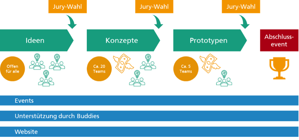 Jede Phase endet mit einer Bewertung durch eine Jury (bestehend aus Vertreter:innen aus Wirtschaft, Wissenschaft und Gesellschaft). Am Ende wird im Rahmen eines Abschlussevents die beste Idee gekürt (siehe Abb.).