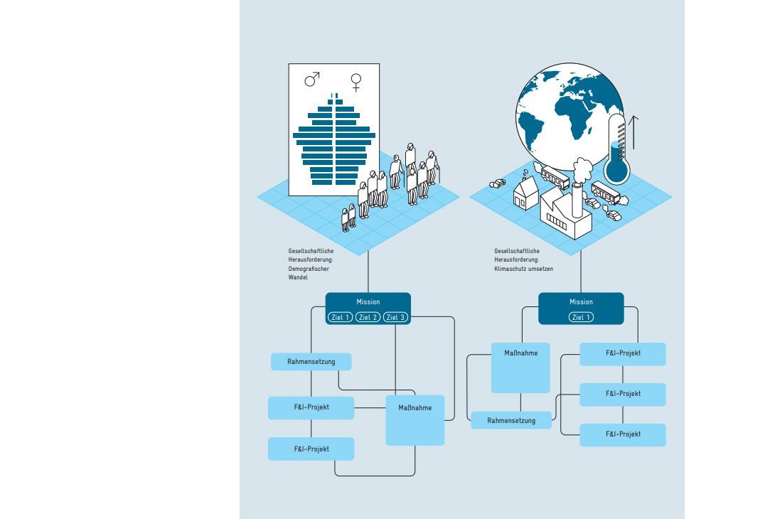 • Wir haben große gesellschaftliche Herausforderungen zu bewältigen – wie den Klimawandel und den demografischen Alterungsprozess der Gesellschaft. Hier steht auch die Forschungs- und Innovationspolitik in der Verantwortung, ihren Beitrag zu leisten. So lassen sich zum Beispiel die ambitionierten Treibhausgasminderungsziele, zu denen sich Deutschland verpflichtet hat, nicht ohne technologische und soziale Innovationen sowie neue Geschäftsmodelle erreichen.