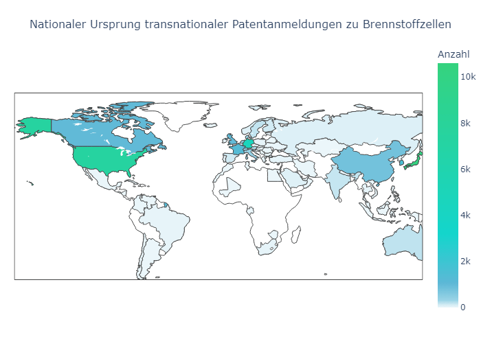 Im Zeitraum von 1985 bis 2020 sind weltweit über 30.000 Erfindungen mit Bezug zu Brennstoffzellen marktübergreifend zum Patent angemeldet worden. Rund ein Drittel davon stammt aus Japan. Deutschland rangiert mit 4.642 Anmeldungen hinter den USA (7.339) international auf dem dritten Platz, gefolgt von Südkorea (1.658), Frankreich (1.280), Kanada (996), Großbritannien (980) und China (777).