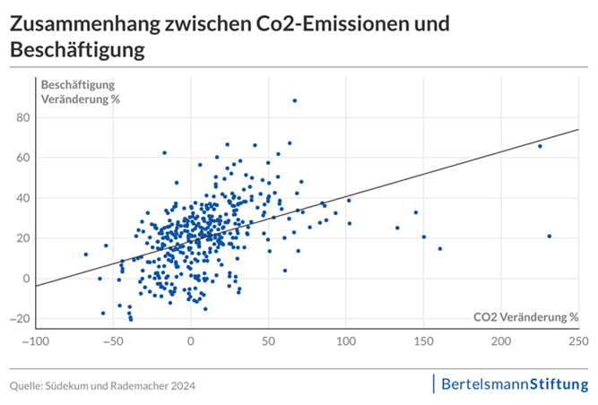 Ein genauerer Blick auf die regionalen Wachstumsmuster der letzten 20 Jahre zeigt, dass Emissisonsrückgang in den meisten Fällen mit Beschäftigungseinbußen bei besonders emissionsintensiven Branchen einhergegangen sein dürfte.