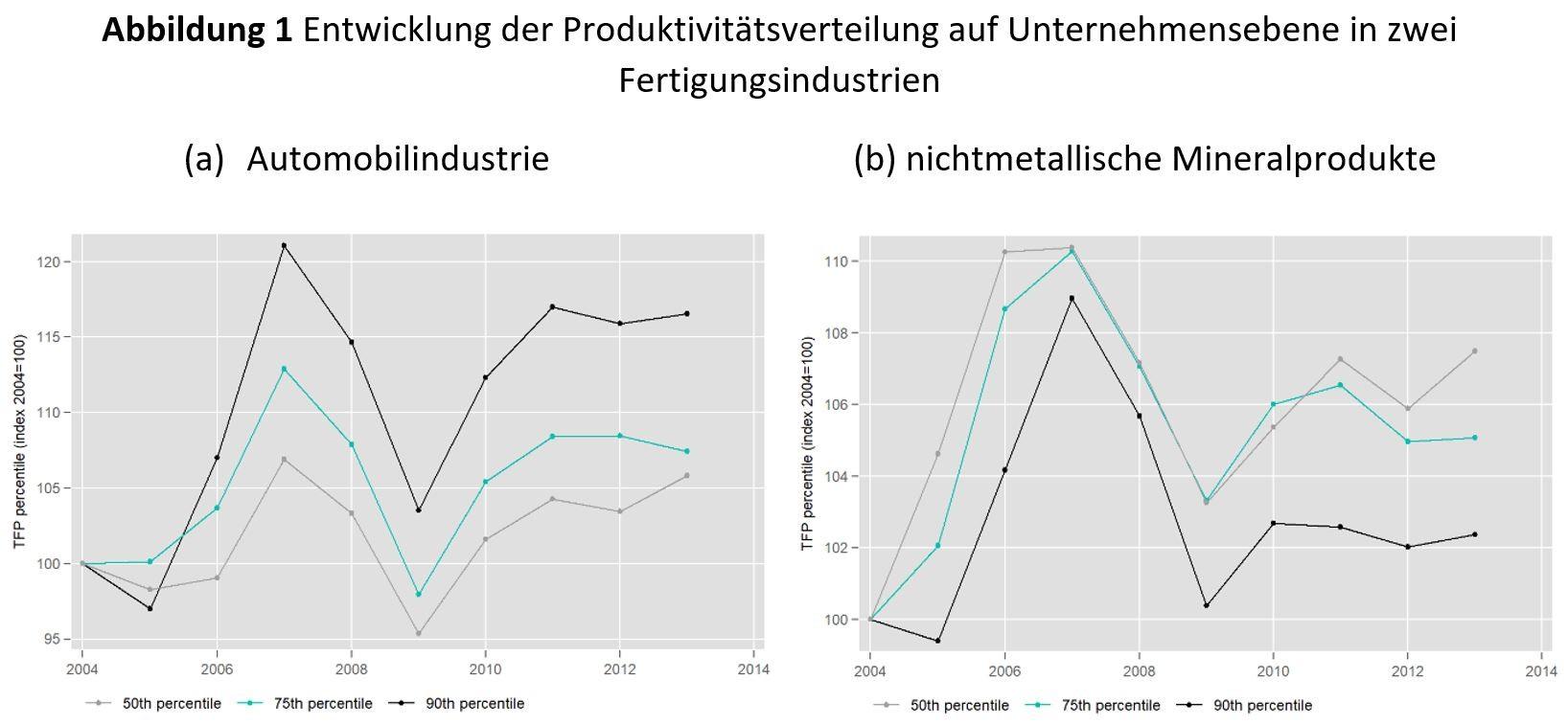 Abbildung 1 veranschaulicht diesen Befund anhand eines Beispiels. Die beiden Panels veranschaulichen die Entwicklung der Verteilung der totalen Faktorproduktivität (TFP) für zwei verschiedene Fertigungsindustrien mit sehr unterschiedlichem Robotisierungsgrad. Die Automobilindustrie (linkes Panel) erlebte zwischen 2004 und 2013 einen spektakulären Anstieg der Roboterdichte. Für diese hochgradig robotisierte Industrie stellen wir fest, dass das 90. Perzentil der Produktivitätsverteilung im Vergleich zum 75. Perzentil und dem Median überproportional zugenommen hat. Das heißt, die produktivsten Automobilhersteller haben ihre Produktivität im Laufe der Zeit viel schneller gesteigert als anfänglich weniger produktive Produzenten.