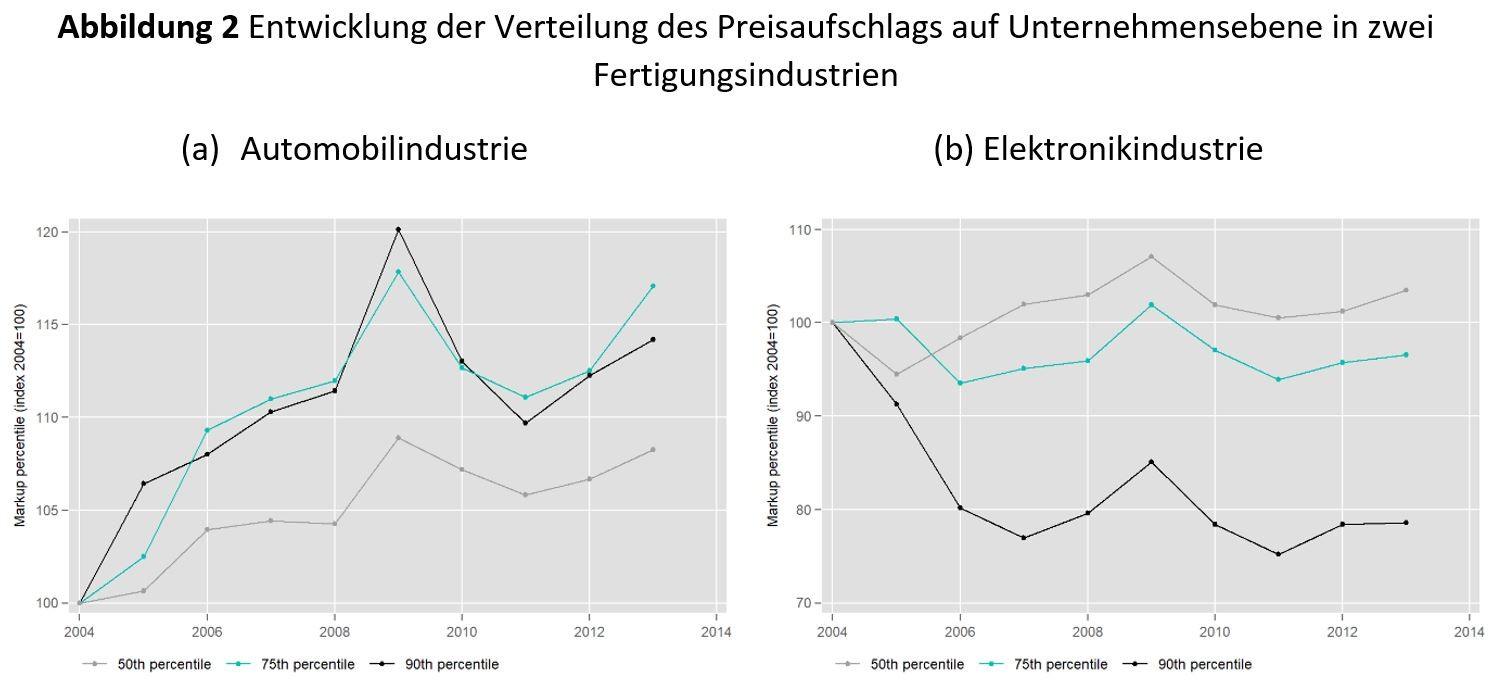 Abbildung 2 zeigt eine ähnliche Analyse für die Verteilung der Preis-Kosten-Margen. Sie zeigt erneut die Entwicklung der Preisaufschlagsperzentile für zwei verschiedene Wirtschaftszweige. In der Automobilindustrie, in der die Zahl der Roboter pro tausend Arbeitnehmer erheblich zugenommen hat, sind das 75. und das 90. Perzentil der Aufschläge deutlich stärker gestiegen als der Median (linkes Panel). Im Gegensatz dazu ist dieses Muster in der Elektronikindustrie (rechtes Panel), die nicht stark robotisiert ist, nicht vorhanden. Hier ist auf Unternehmensebene das 90. Perzentil der Aufschläge in den ersten Jahren der Stichprobe tatsächlich stark zurückgegangen und zeigte ein geringeres Wachstum als die Aufschläge des 75. Perzentil und des Medians.