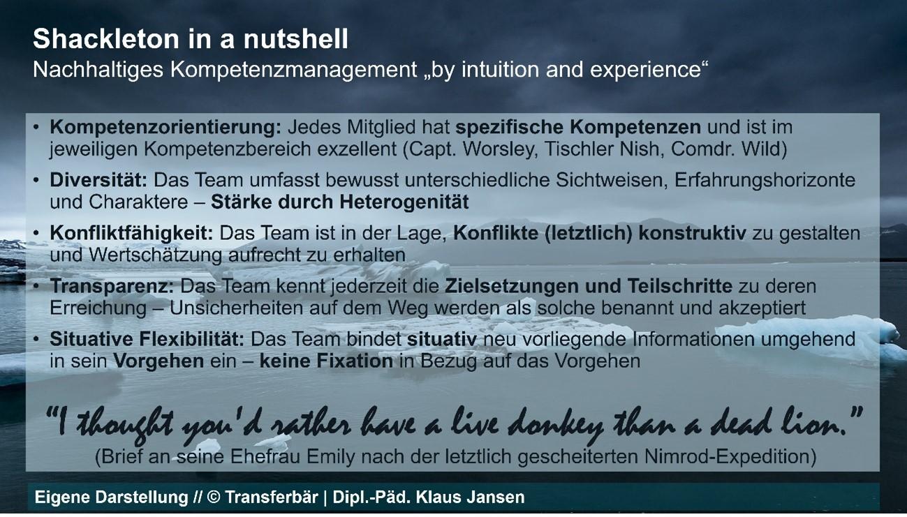 Shackletons brillant gescheiterte Antarktisexpedition zu Beginn des 20. Jahrhunderts ist ein Klassiker der Entdeckerliteratur, der auch unter Führungskräften gern gelesen wird. Für die letztliche Rettung der gesamten Mannschaft seiner Unternehmung sollte der Faktor “Glück” nicht unterschätzt werden. Zugleich lassen sich an diesem historischen Beispiel auch Personal-/Führungsprozesse nachzeichnen, die bis heute relevant sind: Situative Führung, Flexibilität in der Anpassung an wechselnde Situationen und Aktivierung aller Team-Kompetenzen nach den jeweiligen Erfordernissen, gepaart mit offener Kommunikation auch in Krisensituationen. Die nicht nur für diese Zeit bei Shackleton ungewöhnlich ausgeprägte Fähigkeit, positiv zu motivieren und den Sinn des gemeinsamen Tuns zu vermitteln (heute würden wir das u.U. „Purpose“ nennen) würden ihn heute sicher zum gefragten Berater zur sozialen Nachhaltigkeit im Führungskontext machen.