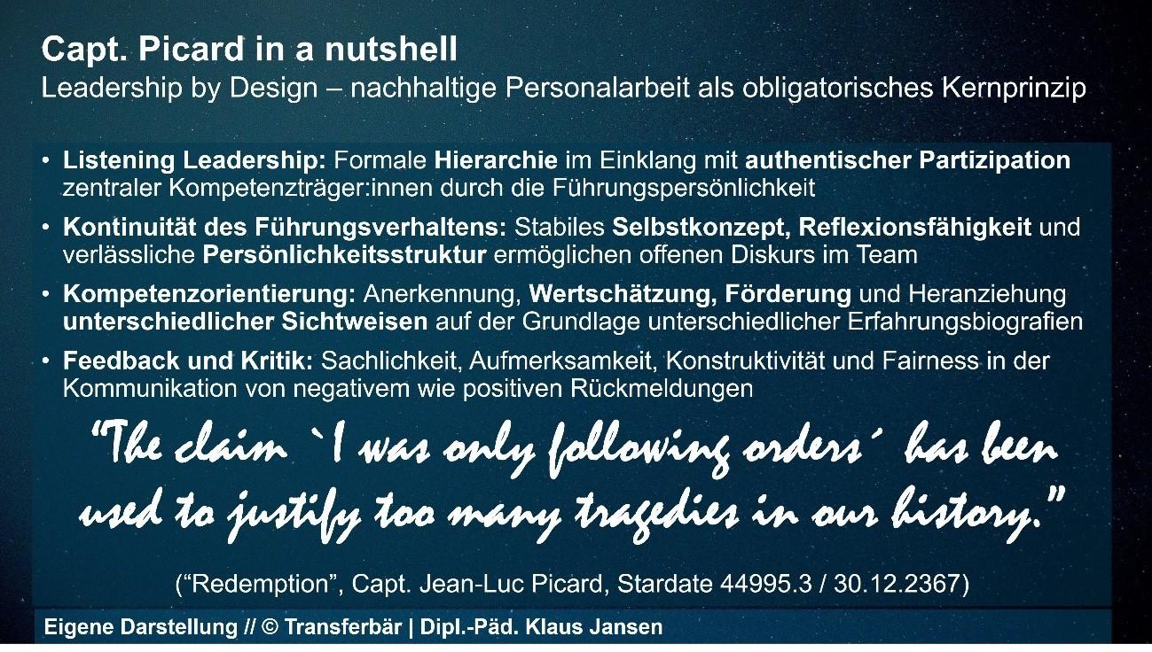 Die Führungskompetenz des Hauptcharakters Captain Jean-Luc Picard (ikonisch in Szene gesetzt durch den britischen Theaterschauspieler Sir Patrick Stewart) in Star Trek – The Next Generation hat bis in die Ausbildung von Führungskräften Eingang gefunden. Zwar spielt diese Science-Fiction-Serie in der fernen Zukunft, allerdings konzipierte man in der Planungsphase zur Serie in den 1980er Jahren für die Leitung des Brückenteams des Raumschiffs „Enterprise“ einen Führungsansatz, den wir heute gut mit sozialer Nachhaltigkeit im Personalumfeld in Einklang bringen können: Lernbereitschaft des gesamten Teams, kooperative Entscheidungsfindung, Akzeptanz und aktiver Einbezug unterschiedlicher Perspektiven und Hintergründe, Reflexion im Team, konstruktive Kommunikationshaltung u.v.m.