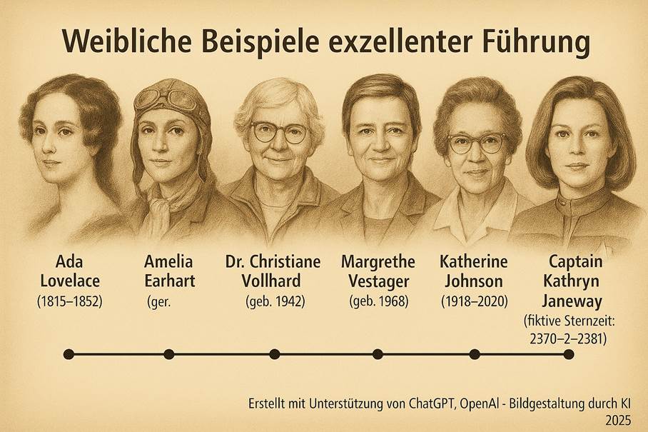 Es liegt auf der Hand, dass „gute“ Personal-, Team- und Führungskompetenz kein männliches Privileg sind: Vergangenheit, Gegenwart und Zukunft sind geprägt von weiblichen und diversen Persönlichkeiten, die intuitiv oder strategisch Prinzipien der sozialen Nachhaltigkeit im Führungsumfeld ein- und umgesetzt haben oder dies tun bzw. tun werden. Skepsis und Ablehnung gegenüber den Potenzialen sozialer Nachhaltigkeit in der Führung erlebe ich im Coaching eher bei männlichen Führungskräften jenseits des 50. Lebensjahrs. Gerade daher sind die obigen Beispiele besonders bemerkenswert. Von Ada Lovelace über Amelia Erhart bis Katherine Johnson und – tatsächlich – Captain Kathryn Janeway als Leitungspersönlichkeit in der Führung des Raumschiffs der Nachfolgeserie Star Trek – Voyager lassen sich viele authentische und fiktive Rollenvorbilder für eine sozial nachhaltige Personalarbeit identifizieren.