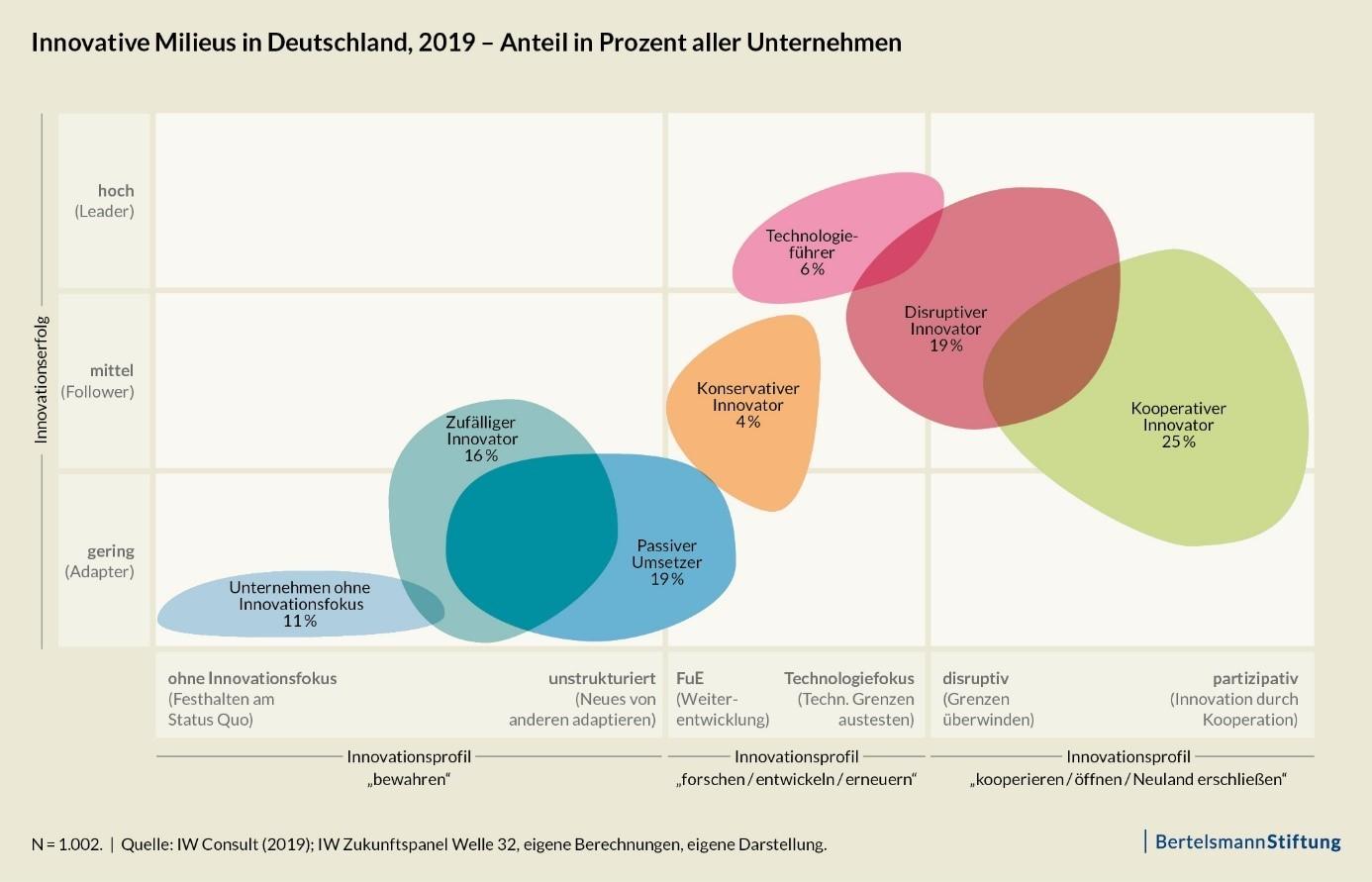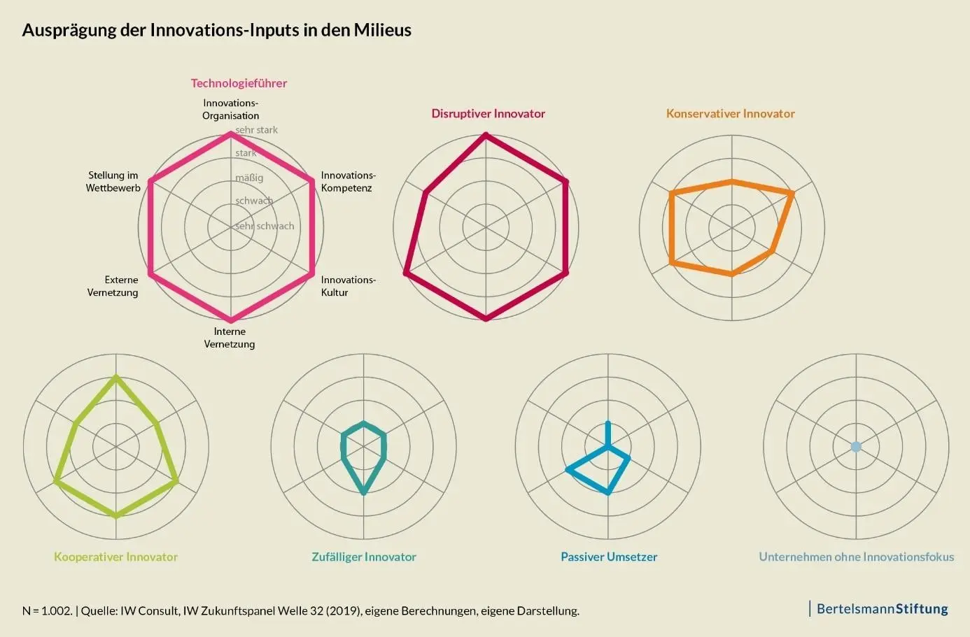 Die innovative Spitze der deutschen Unternehmenslandschaft wird von den Milieus der „Technologieführer“ und der „Disruptiven Innovatoren“ gebildet. Das Milieu der „Technologieführer“ ist durch industrielle Großunternehmen geprägt. Die Branchenschwerpunkte liegen in den Bereichen Chemie, Pharma, Kunststoff sowie der Metall- und Elektroindustrie. Junge Unternehmen aus den Bereichen der unternehmensnahen Dienstleistungen und IKT/Medien prägen das Milieu der „Disruptiven Innovatoren“. Die „Technologieführer“ haben eine starke Technologie-, Wissenschafts- und FuE-Orientierung, die sich auch in hohen Patent-Aktivitäten widerspiegelt, während die „Disruptiven Innovatoren“ sich durch hohe Risikobereitschaft und dem Mut zu radikalen Innovationsprojekten auszeichnen. Bei ihnen spielt zudem die Einbindung und Motivation der Mitarbeiter eine große Rolle.