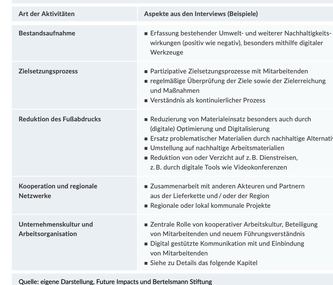 Bemerkenswert ist außerdem, dass bei der Frage nach der Art und Weise der Umsetzung der Nachhaltigkeitsziele stets auf Elemente der Arbeitskultur und der Arbeitsorganisation hingewiesen wird, die aus dem Themenbereich „New Work“ bekannt sind, ohne dass dies explizit als New Work gekennzeichnet oder benannt werden: Flache Hierarchien, wertegetriebene Beschäftigte, flexible Arbeitszeiten und -orte, kooperative Arbeitsmethoden, Eigenverantwortung und die Möglichkeit zur Potenzialentfaltung. Dass diese Art der Arbeitskultur unabdingbare Voraussetzung einer nachhaltigen betrieblichen Transformation ist, kann jedoch auf Basis der 18 Interviews nicht geschlussfolgert werden.