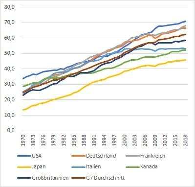 Wir unterschätzen allmähliche Verbesserungen systematisch. Menschen nehmen viele kleine Steigerungen ihres Lebensstandards kaum wahr. Dabei produzieren all die inkrementellen Fortschritte, die sich über lange Zeiträume einstellen, in der Summe stattliche Resultate. So ist die Wirtschaftsleistung pro Kopf zwischen 1990 und 2018 um rund 50 Prozent gestiegen, in Deutschland genauso wie in den USA. Selbst im rasch alternden Japan, das als sieche Volkswirtschaft gilt, hat die Wirtschaftskraft pro Einwohner im selben Zeitraum um insgesamt 29 Prozent zugelegt. Klar, solche Durchschnittszahlen sagen noch nichts über die Verteilung der Einkommen oder die Entwicklung von Arbeitszeiten und Erwerbsbeteiligung aus. Aber von Stillstand kann wahrlich keine Rede sein.