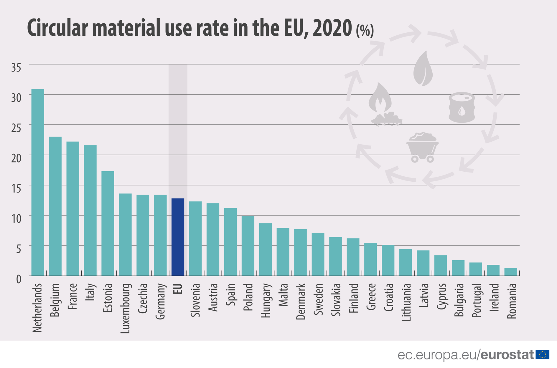 Nur etwas mehr als 12 Prozent der eingesetzten Rohstoffe werden durch Recycling oder andere Formen der Wiederaufarbeitung neu nutzbar gemacht. In den Niederlanden gilt dies für mehr als 30 Prozent der Materialien, in Belgien, Frankreich und Italien für mehr als 20 Prozent.