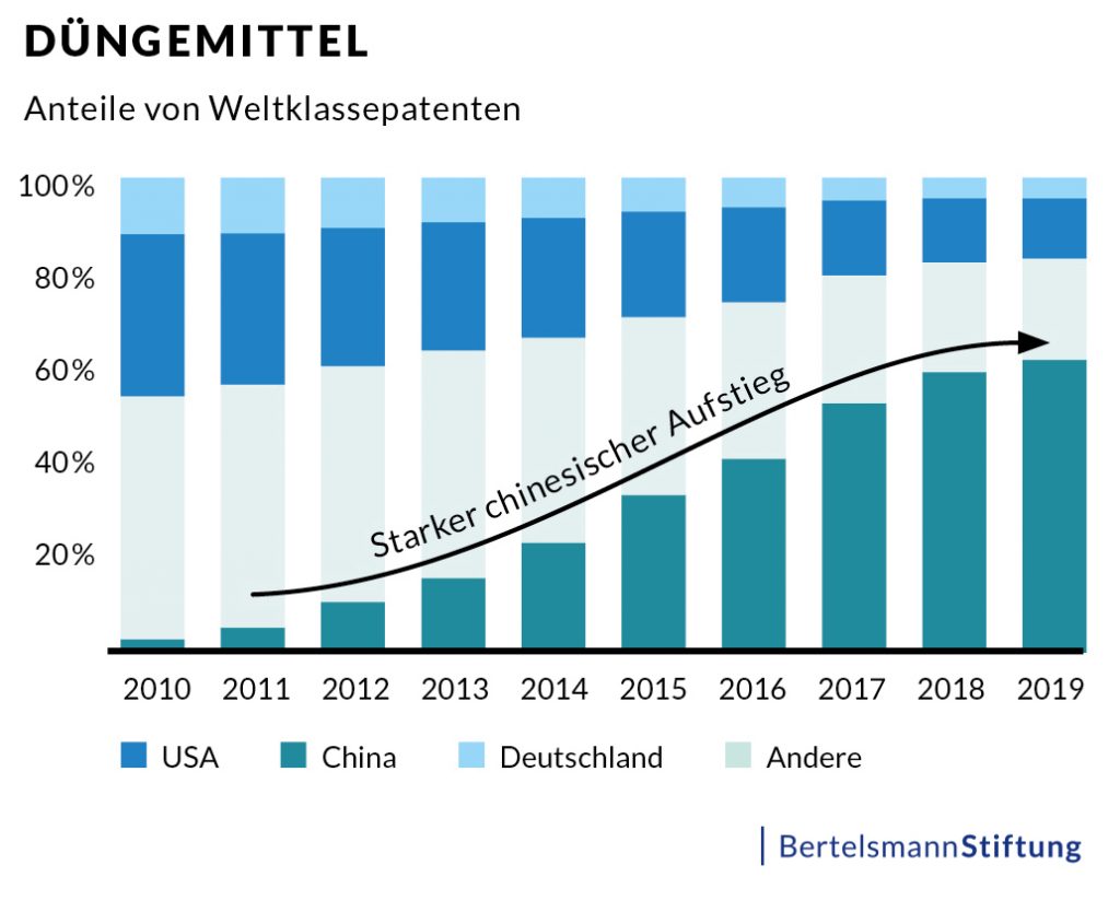 Während der allgemeine Vorsprung der USA beeindruckend ist, gilt dies bei China für die erkennbare Dynamik des Aufholprozesses. So war die Volksrepublik noch im Jahr 2000 kein ernsthafter Herausforderer im Bereich des geistigen Eigentums: Nicht in einer einzigen der 58 Zukunftstechnologien erreichte sie damals eine Position unter den fünf Nationen mit den meisten Weltklassepatenten. Im Jahr 2010 hatte sie bereits etwas an Boden gewonnen, schaffte es aber immer noch bei keiner der Technologien unter die ersten Favoritenränge. Heute hält China dagegen in fünf Technologien die meisten Spitzenpatente und hat es in 37 weiteren Technologien unter die Top 3 geschafft. So kann China etwa bei Recycling, Wasseraufbereitung oder Abfallmanagement gleich in drei Umwelttechnologien seine Konkurrenten überflügeln und besitzt nun in diesen Bereichen die meisten Weltklassepatente. Auch bei den beiden Ernährungstechnologien Biozide und Düngemittel ist China bereits führend. Die Düngemittel zeigen dabei eindrucksvoll eine Entwicklung für China, das praktisch aus dem Nichts kommend nun in den letztgenannten Technologien deutlich vor allen anderen Ländern, einschließlich der Vereinigten Staaten, rangiert.