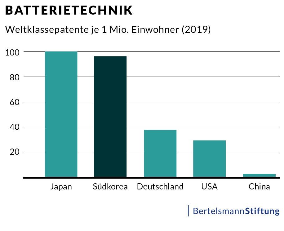 So weit, so absehbar? Angesichts seiner Größe und seines Forschungspotenzials erscheint es kaum als Wunder, dass China bei dieser Entwicklung nicht nur viele Patente mit inkrementellen Verbesserungen, sondern auch zahlreiche Weltklassepatente hervorbringen konnte. Doch der Aufstieg Ostasiens beschränkt sich nicht nur auf sein wichtigstes Kraftzentrum. So bleibt Japan nach wie vor ein sehr beachtlicher Akteur – es hält die meisten Weltklassepatente in drei Technologien. Vor allen aber hat sich auch Südkorea aufgrund seiner Wachstumsdynamik ebenfalls einen Platz in der Spitzengruppe erobert. Genau wie China war das Land im Jahr 2000 nirgendwo unter den fünf Nationen mit der höchsten Zahl von Weltklassepatenten zu finden. Im Jahr 2019 konnte es in 29 Technologien einen Platz unter den Top 5 erreichen. In mehr als der Hälfte aller betrachteten Technologien nimmt damit Südkorea bei der Zahl der Weltklassepatente den fünften Platz oder besser ein. Im Verhältnis zur Größe des Landes ist seine Leistung dabei sogar noch einmal beeindruckender.