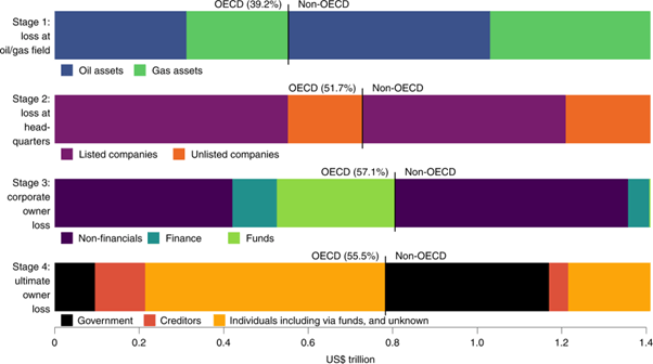 Abbildung 1 zeigt, dass sowohl internationale Ölkonzerne (z.B. ExxonMobil oder Shell) durch ihre Operationen im Ausland (Stage 2) als auch Finanzinvestoren durch internationale Portfolien (Stage 3) fast ein Fünftel der Wertverluste in OECD-Länder transferieren.
