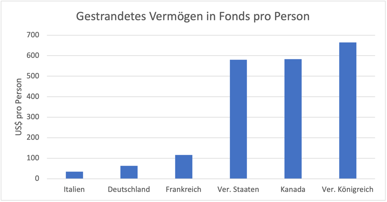 Abbildung 2: Gestrandetes Vermögen, das in Fonds, inklusive Rentenfonds gehalten wird, geteilt durch die Bevölkerung des jeweiligen Landes.