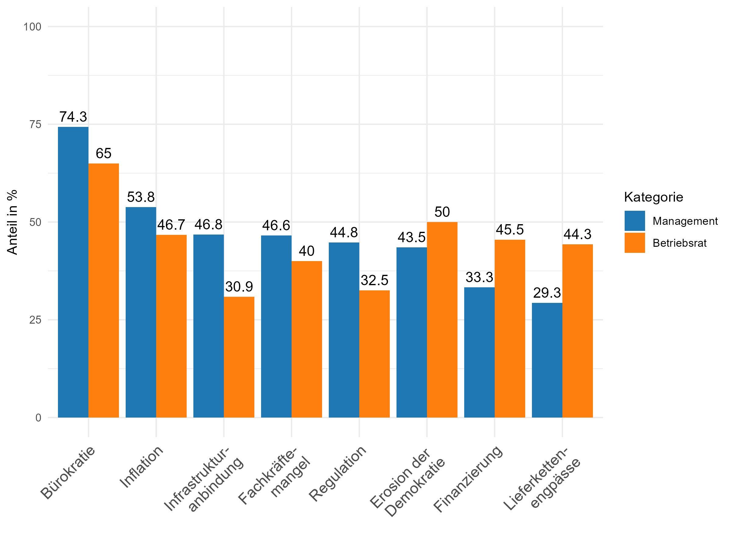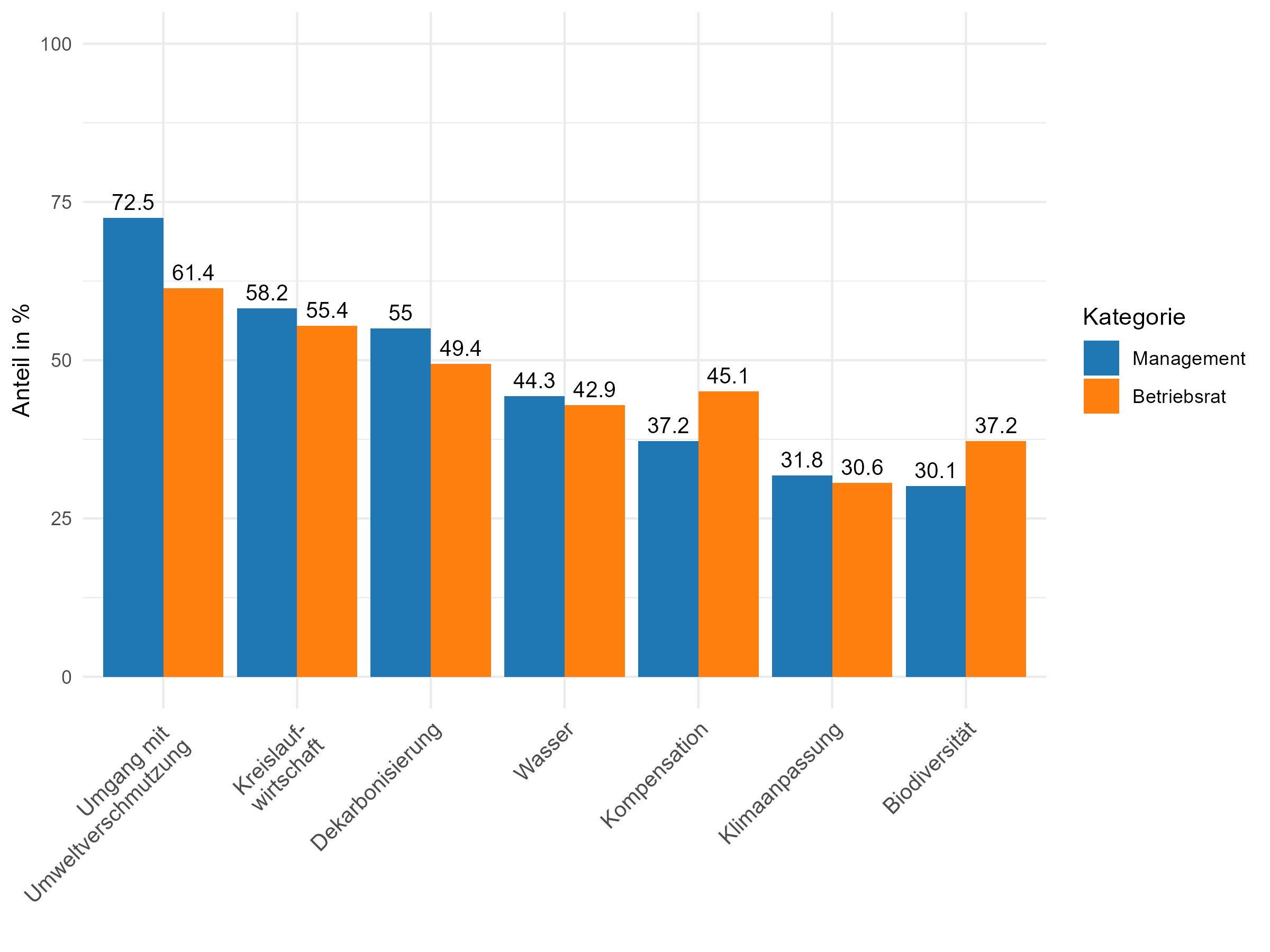 Bei sozialen Themen ist eine deutliche Diskrepanz zwischen der Wahrnehmung von Management und Betriebs- und Personalräten erkennbar, insbesondere bei den Themen Arbeitsplatzsicherheit, Teilhabe sowie Aus- und Weiterbildung.