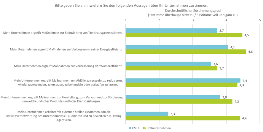 Wenig überraschend ergreifen größere Unternehmen in deutlich stärkerem Umfang Maßnahmen zur Wahrnehmung ihrer Umweltverantwortung als kleinere und mittlere Unternehmen (KMU).