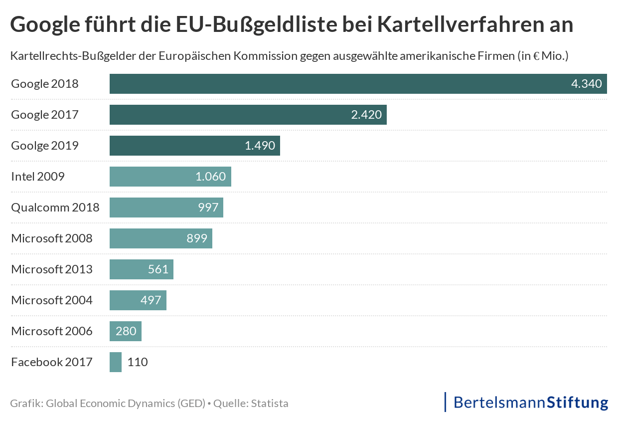 Doch aufgrund dieses Unterschiedes – dem Nachweis des wettbewerbsschädigen Verhaltens und dem Eingriff im Nachhinein – erweist sich das Kartellrecht zuteilen als stumpferes Schwert in der Digitalwirtschaft als eine Regulierung. Die Europäische Kommission hat mittlerweile drei große Kartellrechtsverfahren – genauer Missbrauchsverfahren – gegen Google geführt. Nach jahrelangen Rechtsstreitigkeiten hat sie alle Prozesse gewonnen und jeweils Rekordkartellstrafen von mittlerweile insgesamt über acht Milliarden Euro verhängt.